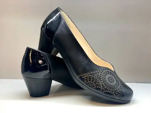 Alpinan nahkainen avokas leveällä K-lestillä. Kärki ja kanta kaunista lakeria. Kengässä lisäksi hillitty ruskea kuviointi pienten reikien kanssa edessä. Pohja pienellä kuvioilla.