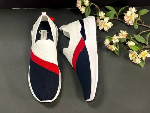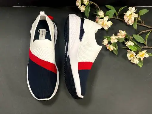 Aran tekstiilitennarissa on hieman joustava pinta. Irrotettava pohjallinen on Aran pehmeää High soft -mallia. Kengän kärki on tummansininen, välissä on noin 2,5cm leveä punainen raita ja kengän suuaukon ympäriltä kangas on valkoinen. Kannassa on metallinsävyinen koriste. Kannan korkeus noin 4cm, edestä noin 2cm.