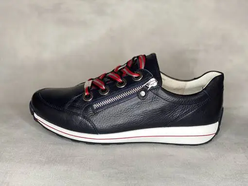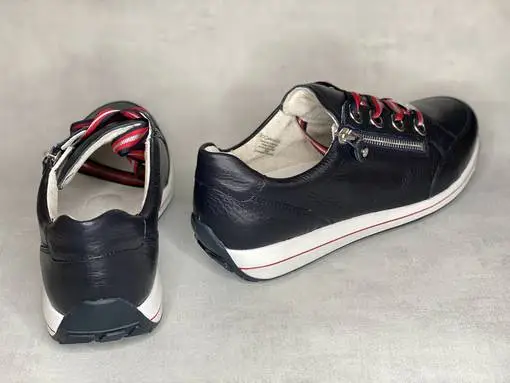 Tummansiniset Ara Osaka High soft tennarit on valmistettu laadukkaasta nahasta. Ihanan pehmeä vuoriset kengät, joissa on Aran High soft-pohjalliset. Ulkosyrjällä oleva vetoketju on yksityiskohta, mutta helpottaa myös pukemista. Tummansinisen kävelykengän look hioutuu huippuunsa kolmivärisillä kengännauhoilla. Valkoisessa pohjassa on ohut punainen raita.