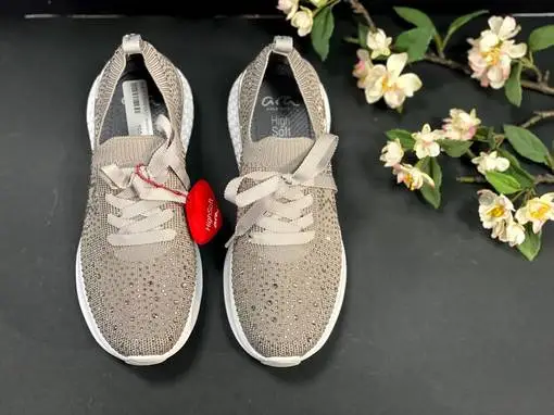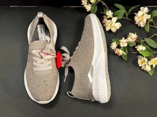 Joustava harmaa tennari on kuorrutettu eri kokoisilla strasseilla. Metallikoriste kannassa on näyttävä yksityiskohta. Poikkeuksellisen mukava High-Soft pohjallinen tukee ja pehmittää askelta. Irrotettavan pohjallisen ansiosta kenkään sujahtaa näppärästi oma pohjallinen.