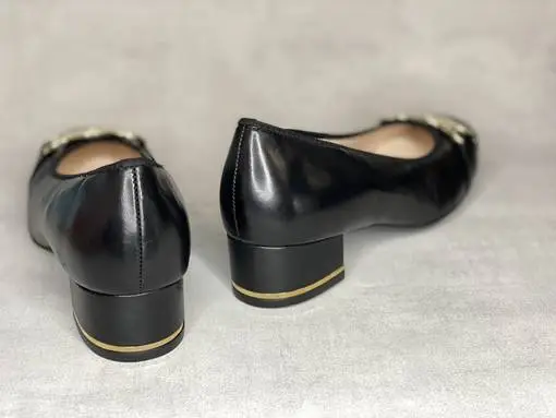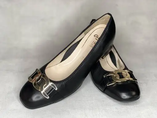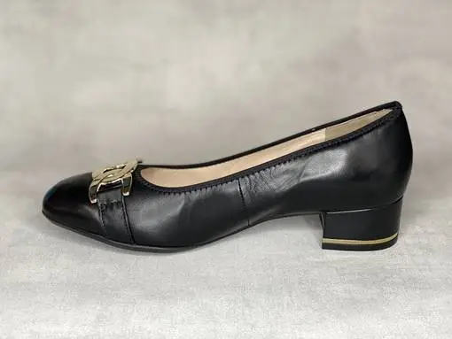 Mustat Ara H avokkaat. Avokkaissa on tukeva paksu korko, jonka alareunassa on kullanvärinen raita. Kullanvärinen kärkikoriste. Avokkaiden pinta on laadukasta nahkaa ja sisäpohja varustettu ihanan pehmeällä kiinteällä Ara High Soft pohjallisella.