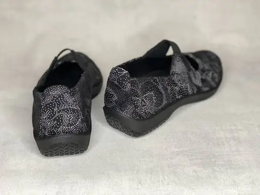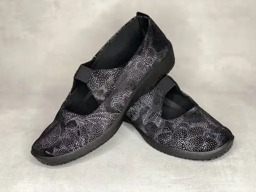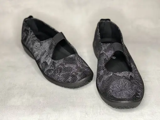 Musta-valkoiset Arcopedico kengät. Pohjaväriltään mustat kengät, joissa valkoinen muodostaa kengän pintaan kukkakuvioita.