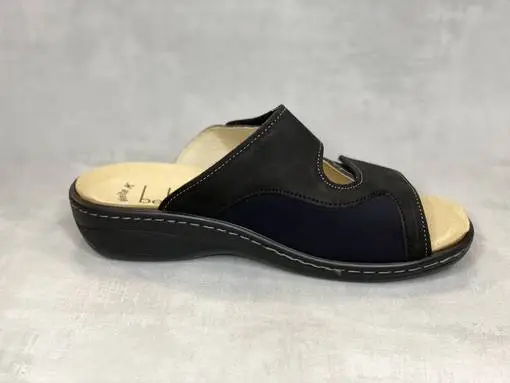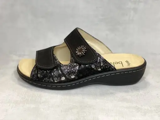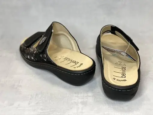 Mustat Belvida sandaalit kahdella tarralla säädettävällä remmillä. Vaihdettava pohjallinen, jonka jalkaa vasten tuleva pinta on nahkaa. Sopii ortopedisille pohjallisille. Sisäsyrjällä joustava osio.