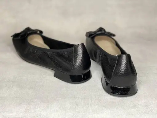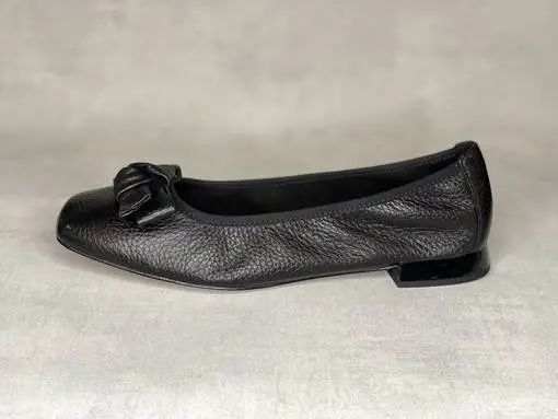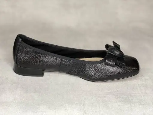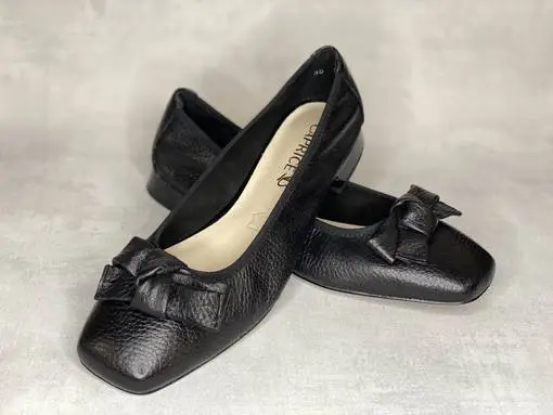 Mustat Caprice ballerinat koristeellisella rusetilla. Peurannahkaiset ballerinat ovat pehmeät ja mukautuvat käytössä jalkaan. Tyylikäs neliskanttinen kärki.