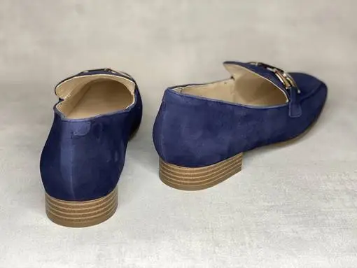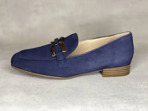 Tummansiniset Caprice loaferit. Nupukkinahkaiset loaferit ovat saaneet kullanväriset koristeet. Trendikäs neliön mallinen kärki. Nahkakenkä mukautuu käytössä juuri sinun jalkaasi sopivaksi.