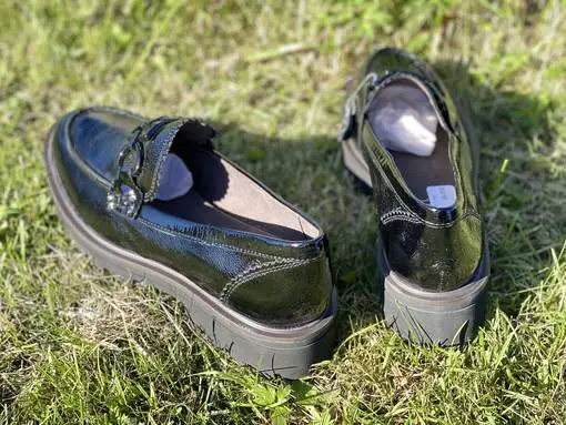 Mustat ryppylakerinahkaiset Caprice loaferit. Kengän päällä on musta metallinen ketjukoriste. Iltissä on yksityiskohtana piparireuna, samoin kantakappaleessa. Näissä loafereissa on vaihdettava pohjallinen ja tarvittaessa kenkä on käytettävissä myös ilman pohjallista.
