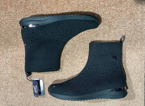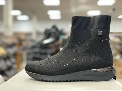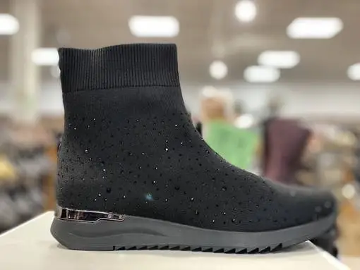 Capricen ihanassa tekstiilinilkkurissa kimaltelevat upealla tavalla valoa taittavat strassit. Kenkä joustaa reilusti, joten se sujahtaa sujuvasti jalkaan. Irrotettavassa sisäpohjallisessa on ilmakuplia, jotka pehmittävät askellusta. Tarvittaessa pohjallisen voi vaihtaa omaan jalkaan parhaiten sopivaan tai käyttää kenkää jopa ilman sisäpohjallista.