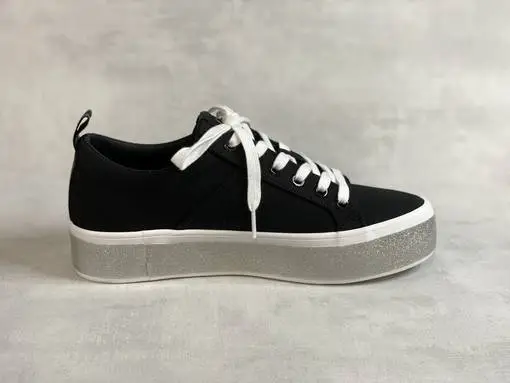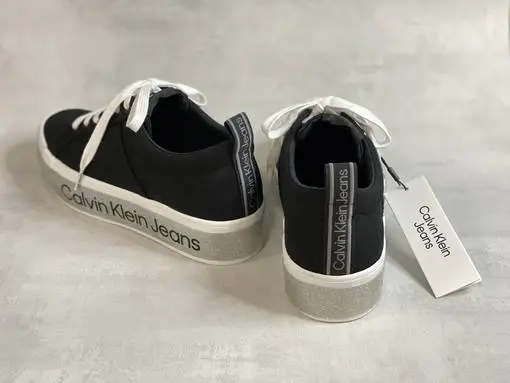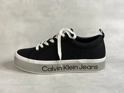 Mustat Calvin Klein Jeans Flatform vulcanized 3 tennarit paksulla hopeisella pohjalla, jossa Calvin Klein Jeans teksti. Pehmeä sisäpohjallinen.
