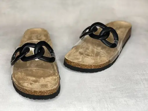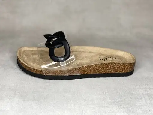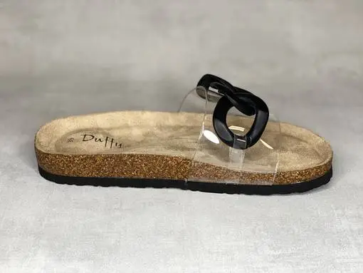 Läpinäkyvällä remmillä varustetut Duffy sandaalit rouhealla mustalla koristeketjulla. Muotoiltu tekstiilipintainen sisäpohja.