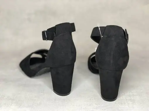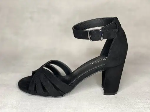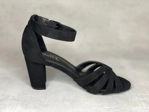 Mustat nilkkaremmilliset Duffy sandaalit. Mokkanahkaa muistuttava tekstiilipinta. Soljellinen nilkkaremmi, jossa pieni istuvuutta parantava venyke. Kannan korkeus noin 7cm.
