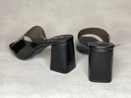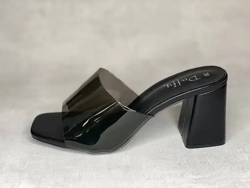 Mustat Duffy sandaalit läpikuultavalla pääliosalla. Tukeva alaspäin levenevä korko. Tyylikäs katkaistu kärki.