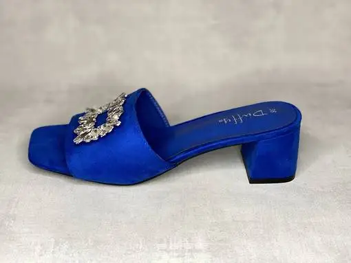 Siniset korolliset Duffy sandaalit näyttävällä strassikoristeella. Mokkaa muistuttava tekstiilipinta. Tyylikäs neliön mallinen kärki ja maltillisen korkuinen tukeva korko.