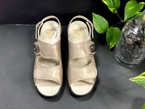 Kengässä on kaksi tarrakiinnitteistä remmiä sekä hopeanvärisellä soljella varustettu nilkkaremmi. Ylemmässä tarraremmissä soikea metallinen koriste. Irrotettavan pohjallisen ansiosta kenkään voi sujauttaa myös oman pohjallisen. Kannan korkeus on noin 3,5cm, edestä noin 1,5cm.