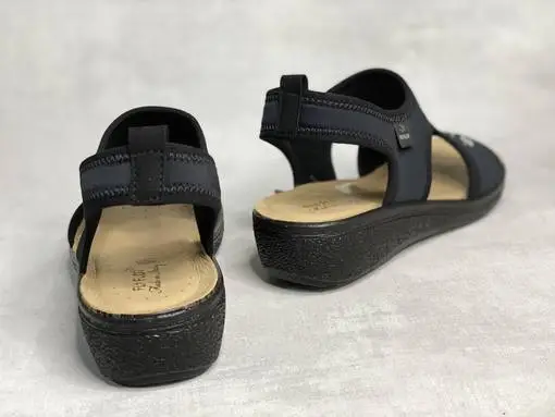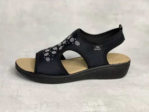 Mustat FlyFlot sandaalit metallinvärisillä strassikoristeilla. Pehmeä pohja tuntuu mukavalta jalan alla ja joustavan materiaalinsa vuoksi kengät sujahtavat jalkaan vaivattomasti, istuen jalkaan hyvin.