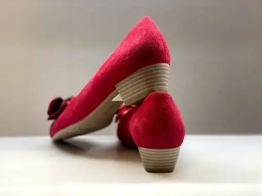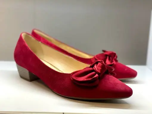 Gaborin ihana, matalakorkoinen avokas arkeen ja juhlaan upeassa punaisen sävyssä. Satiinisen rusetti on sievä yksityiskohta. Mokkanahkainen pinta kannattaa suojata ennen käyttöönottoa suojasuihkeella.
