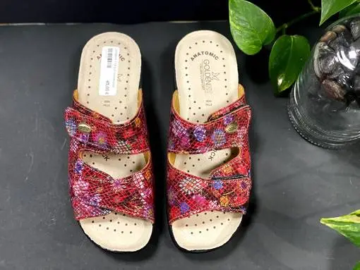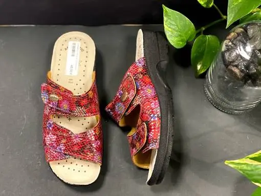 Kahdella säädettävällä tarraremmillä varustettu työsandaali. Ylemmässä remmissä pieni metallinen, soikea comfort -merkki. Kannan korkeus noin 4cm, edestä noin 2cm.