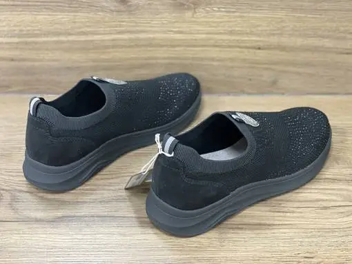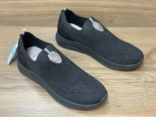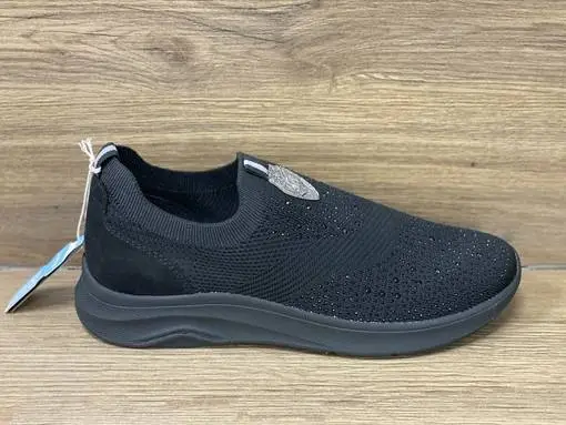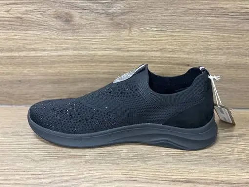 Mustat leveäslestiset Janan venyketennarit upeasti kimaltavin strassiyksityiskohdin. Pehmeä sisäpohja, sopivasti taipuva ulkopohja ja joustava päällinen.