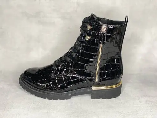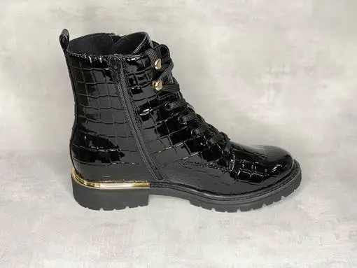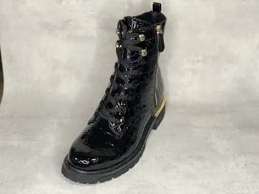 Mustat kiiltäväpintaiset krokokuvioiset Jana maiharit. Kullanväriset yksityiskohdat, ulkosyrjän vetoketju, nauhojen ylälenkit ja kannan koriste. Sisäsyrjällä pukemista helpottava vetoketju. Nauhojen avulla kenkä säätyy sujuvasti omaan jalkaan sopivaksi. Leveämpi H-lesti.