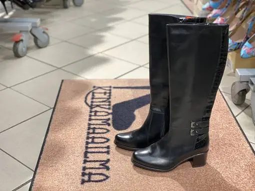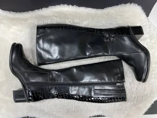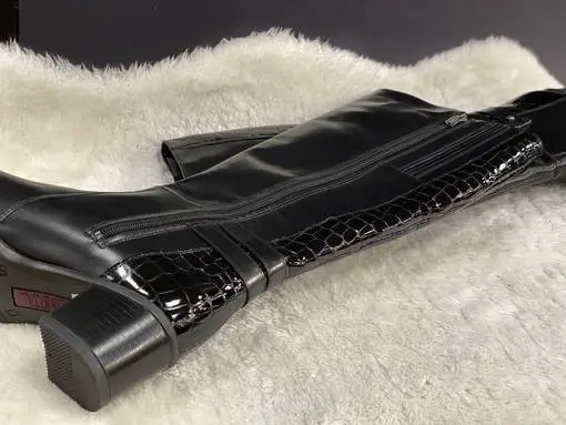 Upea musta nahkasaapas, jonka takaosassa näyttävä krokolakeri-kuvio. Sisäsyrjällä pukemista helpottava vetoketju ja varren yläreunassa istuvuutta parantava venyke. Varren alareunassa on kaksi metallisomiesteista remmiä.