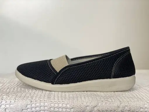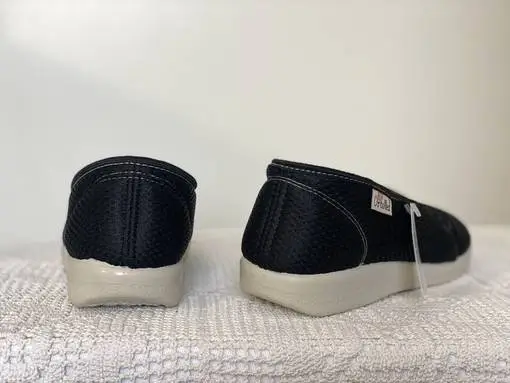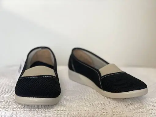 Mustat Ortomed jalkineet ballerina-tyyppisenä ratkaisuna. Koristetikkaukset ovat vaalean beiget, samoin kengän venyke. Pehmeä muotopohjallinen on muotoiltu moneen jalkaan sopivaksi, mutta vaihdettavuutensa ansiosta sen tilalle sujahtaa myös omaan jalkaasi parhaiten sopiva pohjallinen.