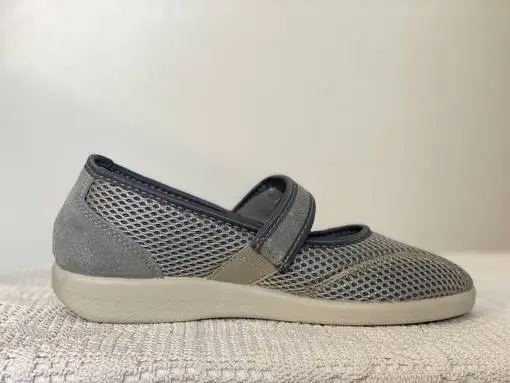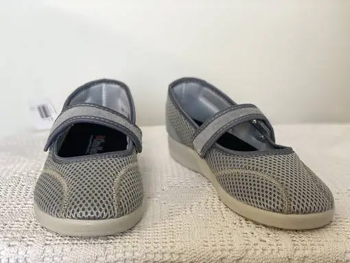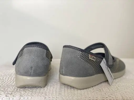 Pehmeät ja kevyet, leveälestiset vaaleanharmaat OrtoMed kengät, joissa tarrallinen remmi. Hengittävä tekstiilipäällinen. Pehmeä muotopohjallinen on helppo vaihtaa tarvittaessa tukipohjallisiin. Sopivat sisä- ja ulkokäyttöön. Helppo pukea!