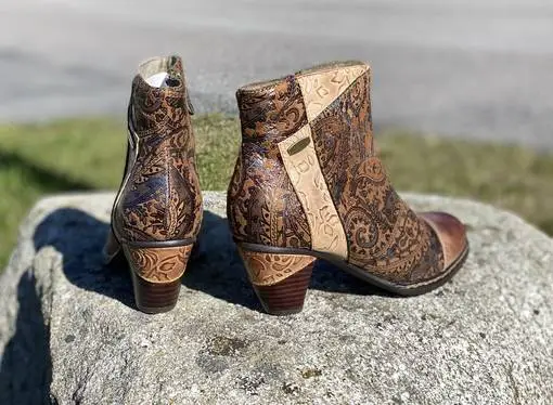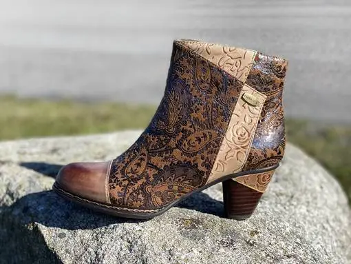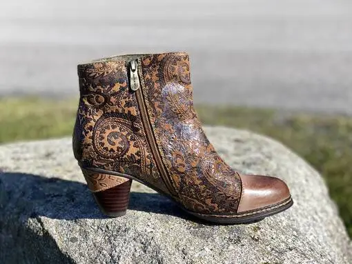 Ruskeat Laura Vita Alizee nilkkurit. Paisley kuviointi sopii tähän nilkkuriin kerrassaan mainiosti. Kuvioinnin seassa on myös metallinhohtoisia tehosteosioita. Ruskea pääväritys yhdistyy vaaleampaan beigeen, jonka lisäksi kenkä saa ilmettä sateenkaaren väreissä vaihtelevista tikkauksista. Sisäsyrjällä on pukemista helpottava vetoketju.