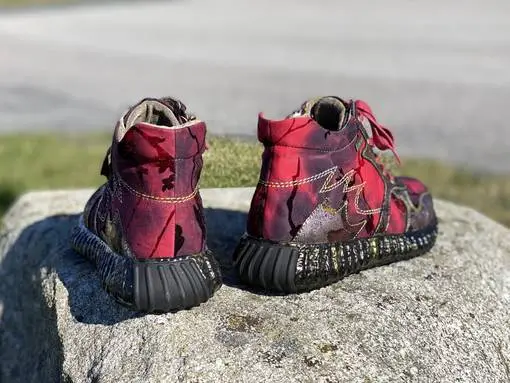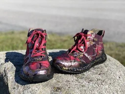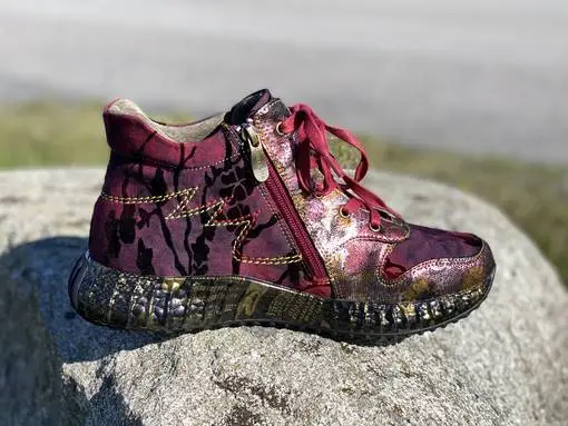 Punaiset korkeavartiset Laura Vita Limited Burton Wine tennarit. Punaisessa osiossa hillitty tummanpunainen oksakuvio. Metallinhohtoisessa osiossa sävyvaihtelua vaaleanpunaisesta oranssiin. Punaiset nauhat ja kuvioitu ulkopohja viimeistelevät lookin. Nauhoilla tennarit säätyvät sopiviksi omaan jalkaan ja sisäsyrjälle sijoitettu vetoketju helpottaa pukemista. Vaihdettava pohjallinen, jonka tilalle sujahtaa tarpeen vaatiessa omaan jalkaasi parhaiten sopiva pohjallinen.