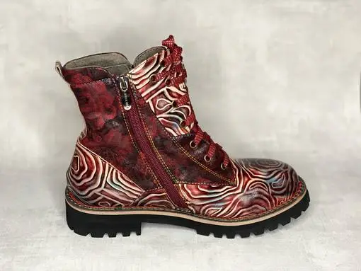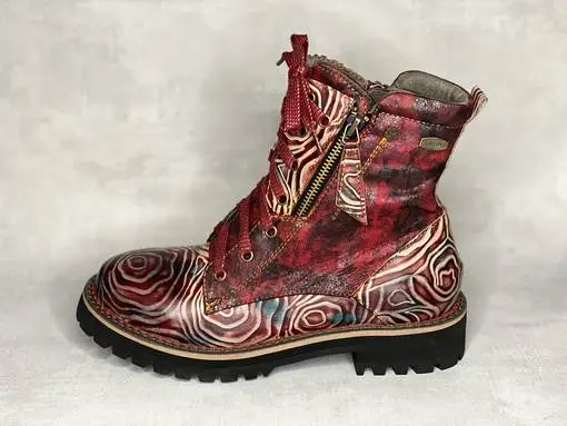 Punaiset Laura Vita Iacniso maiharit. Tuttuun Laura Vita tyyliin tässäkin maiharissa on kaikki mahdollinen herkku ja vielä vähän extraa päälle. Pinta koostuu kahdesta eri kuosista, joista toisessa on epäsymmetrisiä pylpyröitä toistensa sisällä sekä punaisesta marmorikuvioidusta osiosta. Ulkosyrjällä komea koristevetskari jossa näyttävä vedin, sisäsyrjällä pukemista helpottava vetoketju. Punaiset nauhat on viimeistelty hopeankimalluksella. Pinnan ja pohjan väristä reunaa kiertää punainen sekä vihreä tikkaus.