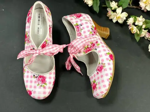 Laura Vitan ruusu- ja ruutukuvioitu avokas ruudullisilla kengännauhoilla. Kengän pinta ja vuori ovat molemmat nahkaa. Kannan korkeus noin 5,5cm. Kenkä on saatavilla kahdessa värissä, vaaleanpunaisena ja vaaleansinisenä.