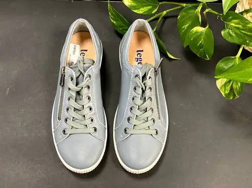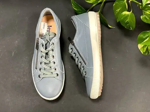 Legeron taivaansininen pintanahkainen citylenkkari. Nauhojen lisäksi kengässä on vetoketju, jonka avulla kenkä sujahtaa vaivattomasti jalkaan.