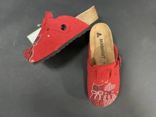 Ihastuttava punainen huopapistokas strassi-kissoilla. Pistokkaassa on soljellinen remmi, jolla voit säätää kengän istuvuutta omaan jalkaasi paremmin sopivaksi. Kengässä on pieni kiilakanta, sisäpohja on anatomisesti muotoiltu ja sen pinta on nahkaa. Lesti on keskileveä.
