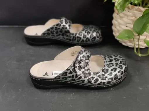 Ihana Maahiset-työsandaali villillä leopradi-kuosilla, metallisomisteella ja umpikärjellä. Kengän istuvuutta voi säätää tarrallisella remmillä. Kannan korkeus noin 3cm, edestä noin 1,5cm.