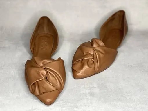 Ruskeat MAGO Shoes ballerinat. Kärjessä näyttävä rypytys. Ballerinoissa on myös tyylikäs kapeneva kärki. Pehmeät nahkaiset ballerinat ovat loistava valinta sekä arkeen että juhlaan.