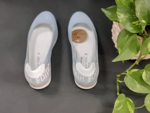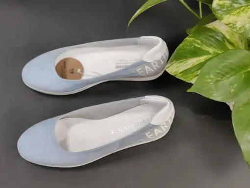Nämä ihanat vaaleansiniset ballerinat ovat täysin vegaaniset! Ballerinassa on maltillinen, noin kahden sentin kiilakorko, joka madaltuu kengän kärkeen noin sentin paksuiseksi. Kantakappaleessa on valkoinen Eearth Edition -teksti. Pohjan kiilareunassa on korkki-materiaalista tehty raita. Pohjallinen on pehmeä jalan alla.