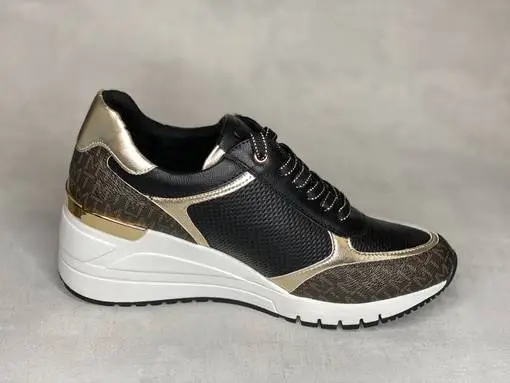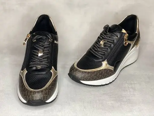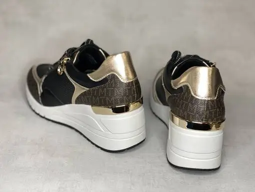 Mustat kiilapohjaiset Marco Tozzi citylenkkarit. Kultaiset yksityiskohdat, kärjessä ja kannassa tummanruskeat osiot joissa MT monogrammi-kuviota. Nauhoilla kenkä säätyy vaivattomasti omaan jalkaan sopivaksi ja ulkosyrjälle sijoitettu vetoketju helpottaa pukemista. Sydänkuvioinen vetoketjun vedin on kullan värinen Ulkopohjan reuna on valkoinen ja sen yläreunassa on kannassa kultainen yksityiskohta. Kevyesti muotoiltu pohjallinen, jonka tilalle vaihdat tarvittaessa omaan jalkaasi parhaiten istuvat pohjalliset.