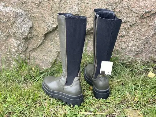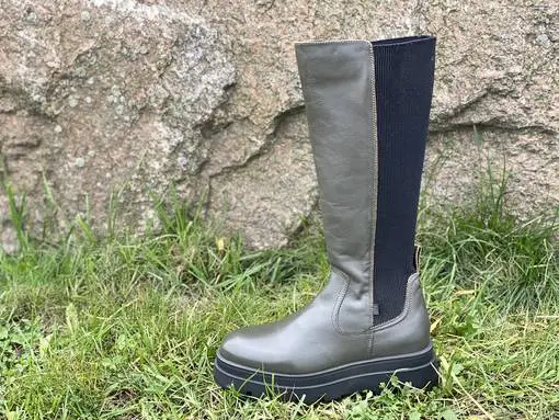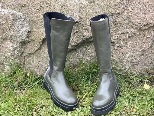 Oliivinvihreät Musse & Cloud Madona nahkasaappaat. Runsaasti joustava venyke kengän takaosassa, sisäsyrjällä pukemista helpottava vetoketju. Venykkeen ansiosta saapas sopii upeasti muodokkaampaankin pohkeeseen.