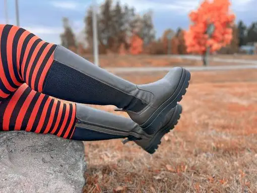 Varren yläreunan ympärysmitta venyttämättä 40cm, venyy 45cm leveään pohkeeseen (kuvissa)