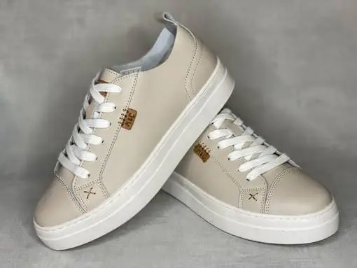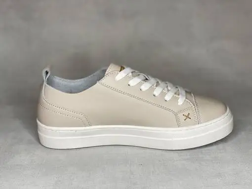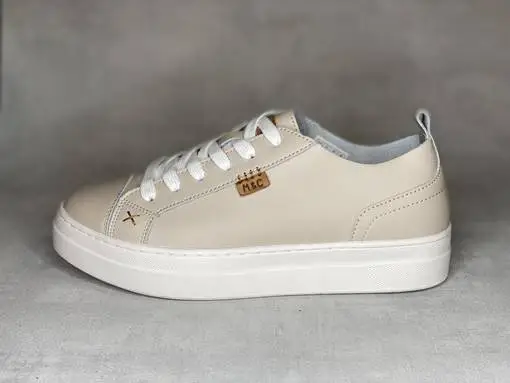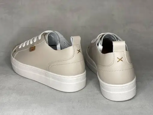 Nudet Musse & Cloud Masy tennarit. Pintanahkaiset tennarit valkoisella ulkopohjalla ja valkoisilla nauhoilla. Ulkosyrjällä pieni konjakinruskea M&C nahkamerkki. Keskellä ilttiä konjakinruskea Musse & Cloud logomerkki. Kärjen molemmin puolin pieni tikattu ruksi. Vaihdettavat pohjalliset, joten tarpeen vaatiessa kenkiin sujahtavat juuri sinun jalkoihisi sopivat pohjalliset.