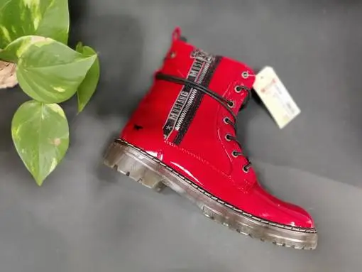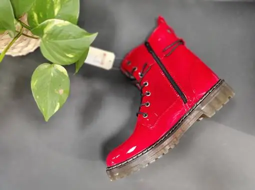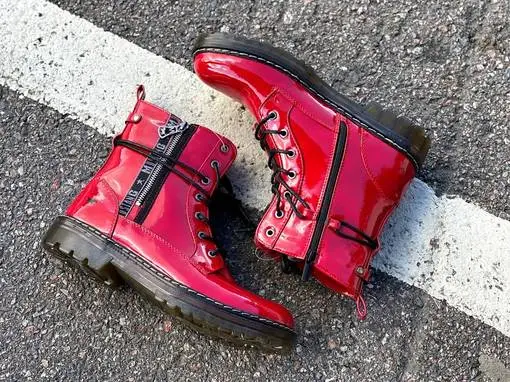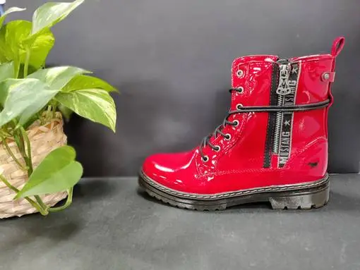 Mustangilla on jälleen pistetty parasta yksityiskohtien kanssa! Kiiltäväpintaisten punaisten maihareiden ulkosyrjällä on näyttävä koristeveteketju upealla vetimellä, sekä mustaharmaata Mustang-tekstillä varustettua kangasnauhaa. Kengännauhat voi halutessaan sommitella monella eri tavalla, sillä kengän varteen on sijoitettu lenkki, josta nauhat voi pujottaa. Kannan korkeus noin 3,5cm, edestä noin 2cm.