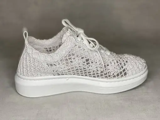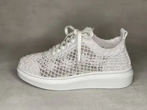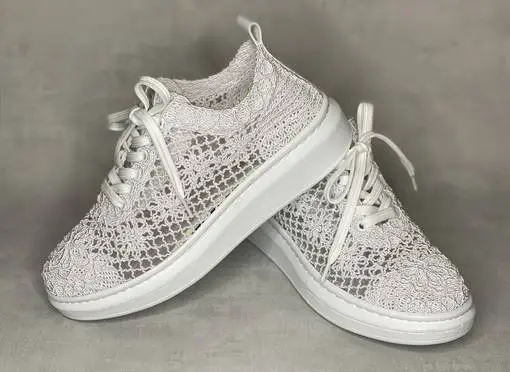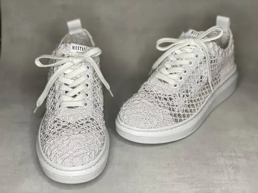 Valkoiset Mustang pitsitennarit ovat ihanan romanttinen valinta lämpimiin kesäpäiviin! Läpinäkyvään kenkään saat lisää ilmettä laittamalla kirkkaanväriset nilkkasukat tai satiiniset kengännauhat.