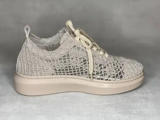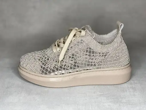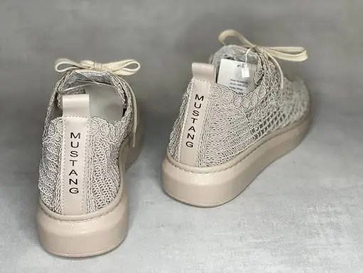 Vaalean beiget Mustang pitsitennarit ovat ihanan romanttinen valinta lämpimiin kesäpäiviin! Kenkä on beige ulkopohjaa myöten. Läpinäkyvään kenkään saat lisää ilmettä laittamalla kirkkaanväriset nilkkasukat tai satiiniset kengännauhat.