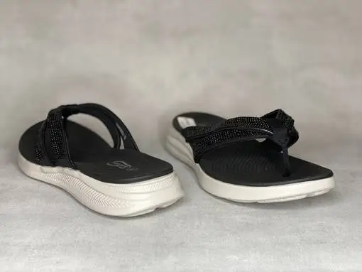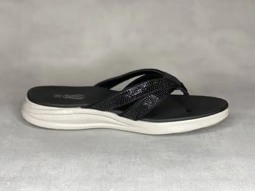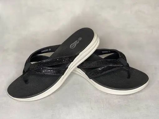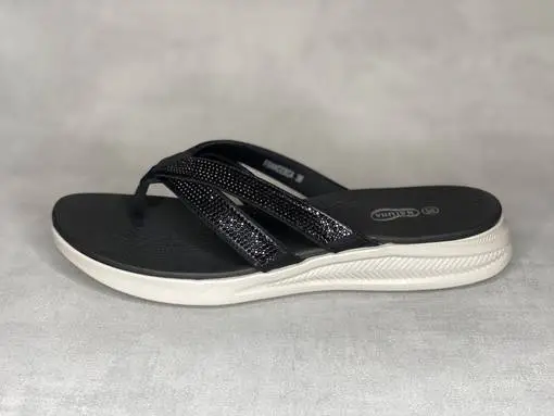 Mustat strassikoristeiset Natura varvassandaalit pehmeällä sisäpohjalla. Upeasti kimaltavat strassikoristeiset remmit, pehmeästä tekstiilistä valmistettu vuori ja jalan alla mukautuva sisäpohja.