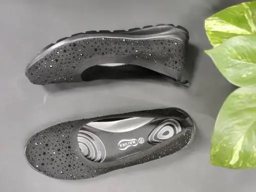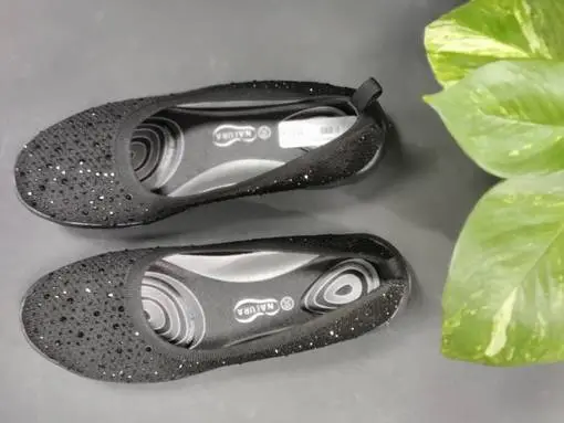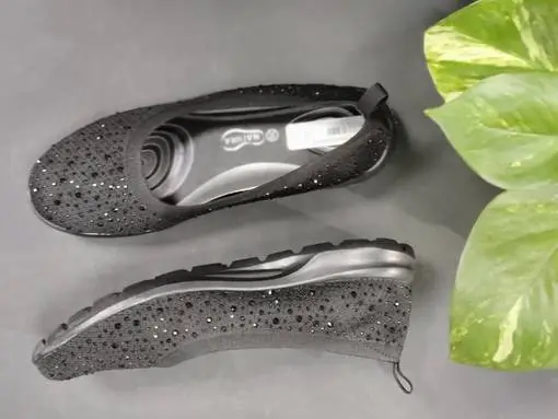Ihastuttava musta tekstiiliballerina strassikoristeilla. Kengässä on vaihdettavaa pohjallinen. Kannan korkeus noin 2,5cm, edestä noin 1,5cm.