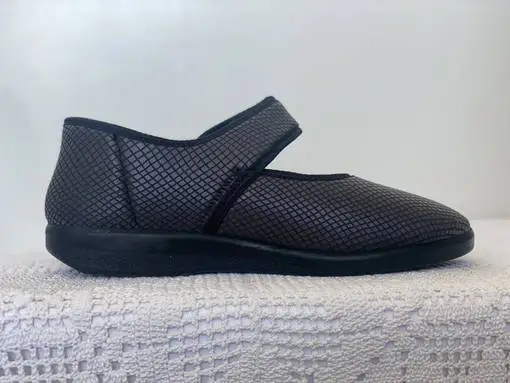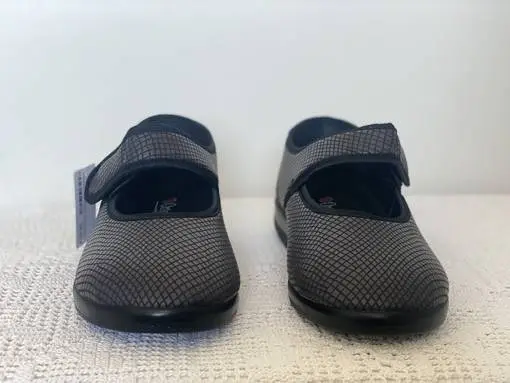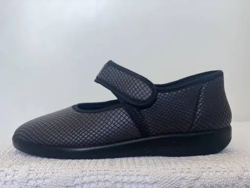 Pehmeät ja kevyet, leveälestiset tummanharmaat, ruudukko-kuvioidut OrtoMed kengät, joissa tarrallinen remmi. Hengittävä tekstiilipäällinen. Pehmeä muotopohjallinen on helppo vaihtaa tarvittaessa tukipohjallisiin. Sopivat sisä- ja ulkokäyttöön. Helppo pukea!