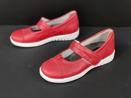 Tarralla varustettu punainen Pomarin kävelykenkä irrotettavalla pohjallisella. Kärjessä on pieni venyke. Kannan korkeus noin 3cm, edestä noin 1,5cm