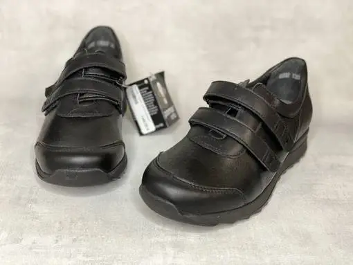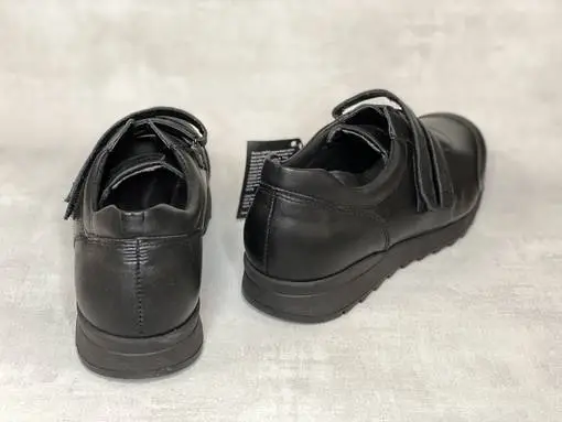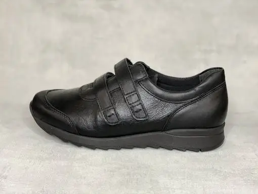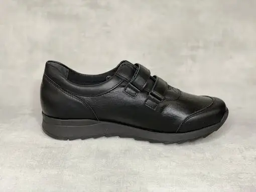 Mustat Pomar Orto NIITTY kävelykengät kahdella tarrallisella remmillä. Leveälestinen ja mukava tennari. Nahkakenkä, jonka kyljissä joustavaa stretch nahkaa. Pomar ORTO mallisto on suunniteltu sinulle, joka tarvitset kengältä leveämpää istuvuutta, mukavuutta, tukea sekä helppoa puettavuutta. Kengissä on nilkkaa ja kantapäätä tukeva vahvistettu kantakappi. Sopii mainiosti myös vaivaisenluulliseen jalkaan.