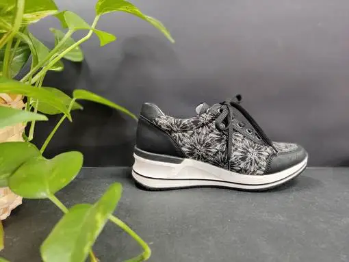 Ihana kukallinen kuosi, jossa yhdistyy musta ja hopea! Kuosiosio joustaa, joten nämä kengät sopivat myös vaivaisenluulliseen jalkaan. Pirteää kuosia rauhoittavat musta kärki ja kanta, sekä mustat nauhat. Nauhojen lisäksi kengän ulkosyrjällä on vetoketju, joten halutessasi voit säätää nauhat vain kerran ja pukea kengän jatkossa vain vetoketjun avulla. Irrotettava Soft-pohjallinen, jonka voit tarvittaessa vaihtaa omaan jalkaasi parhaiten sopivaan pohjalliseen. Kannan korkeus noin 3,5cm, edestä noin 1,5cm.