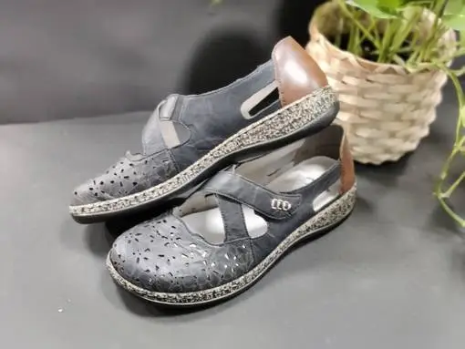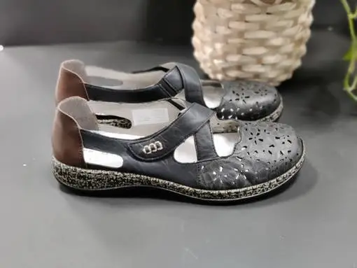 Kukkakuvioiduissa, kärjestä rei’ietetyissä kävelykengissä on tarralla varustettu remmi. Toisessa ristikkäisessä remmissä on sisäsyrjällä pieni venyke. Väriltään nämä kengät ovat tummansiniset. Nahkapinnoitettu pohjallinen tuntuu mukavalta jalan alla.