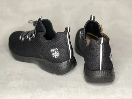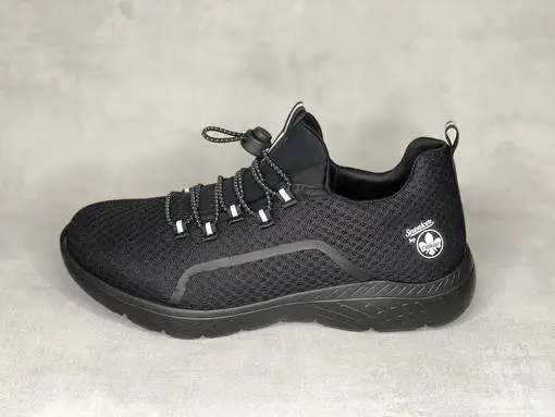 Mustat Sneaker by Rieker tennarit. Nauhallisten tennareiden kannassa on pienellä heijastavalla osiolla varustettu vetolenkki. Vaihdettava MemoSoft pohjallinen, joten tarpeen vaatiessa kenkiin sujahtaa omiin jalkoihisi parhaiten sopivat pohjalliset.