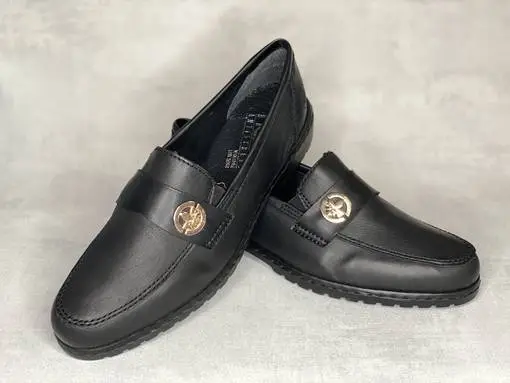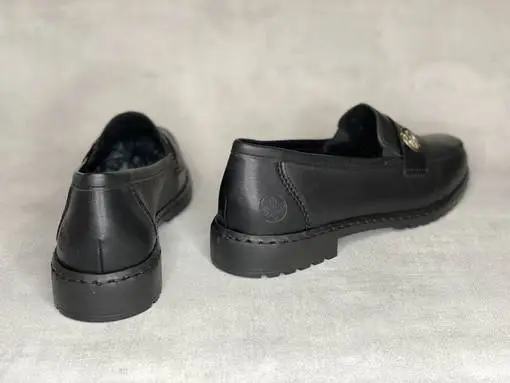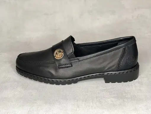 Mustat Rieker loaferit. Ulkosyrjällä pyöreä kullanvärinen Rieker-logo koriste. Kannan korkeus noin 2,5cm, pohja edestä noin 1cm.